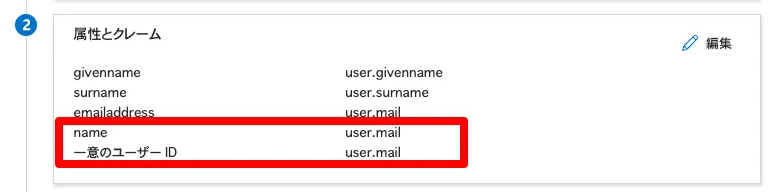 Entra IDのシングル サインオンの属性とクレームにて、 user.userprincipalname で指定されていた部分を user.mail に変更。